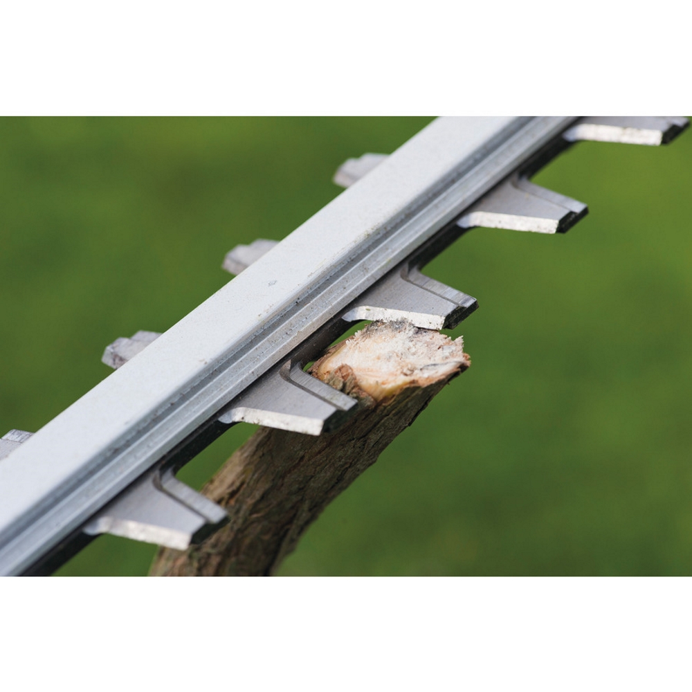 Tagliasiepi a Batteria Ryobi 18V, con lama da 55 cm di lunghezza. La lama è realizzata in acciaio, tagliato al laser e affilata al diamante. Si tratta di una lama a doppia azione, in grado di tagliare i rami da entrambi i lati.